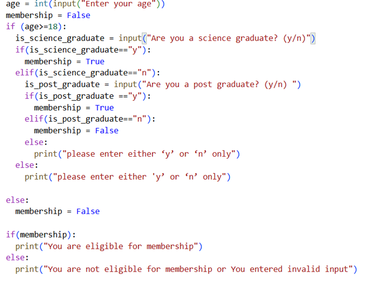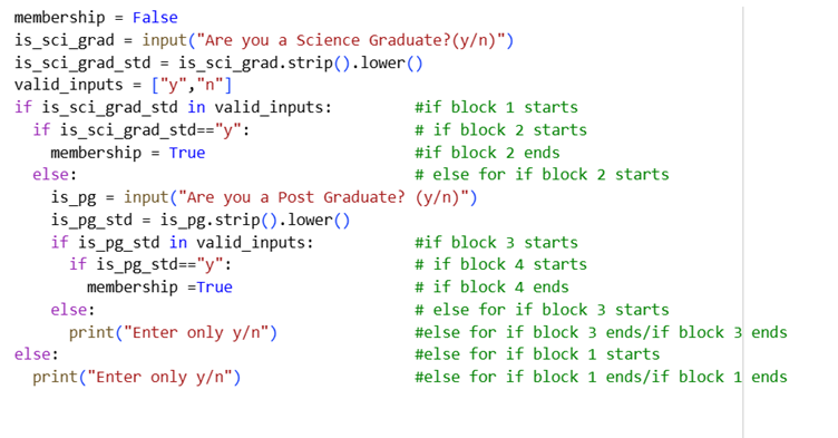 Understand the nested structure of if blocks. Pay close attention to where one block starts and where it ends. Some if blocks don’t have else, simply because it’s unnecessary as membership value is by default set to False and in else block, we would set it False only.