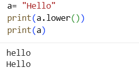 Note that, as in image, when we print a.lower() we get lower case “hello”, but when we print a after that, we get the original string “Hello” only.
