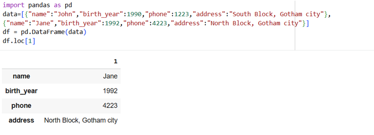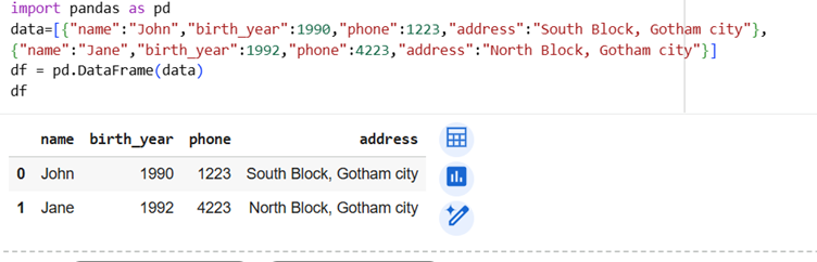 name, birth_year, phone, address will serve as columns of dataframe and (“John”, 1990, 1223, “South Block, Gotham City”) as row.