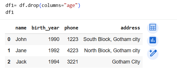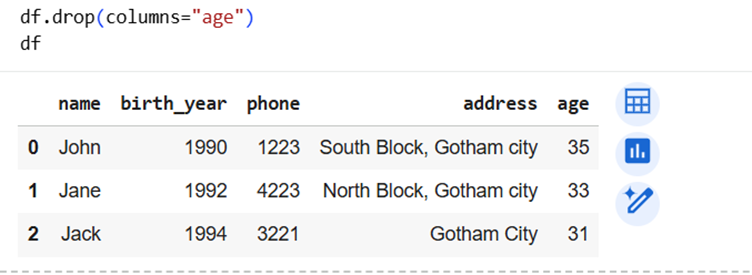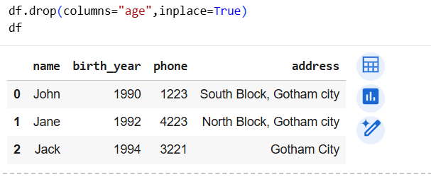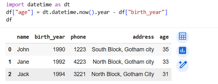 | Add new column | df1["age"] = current_year - df1["birth_year"] |