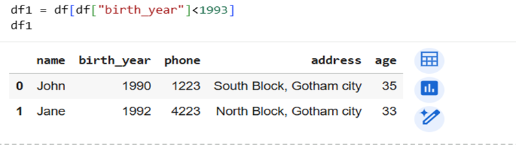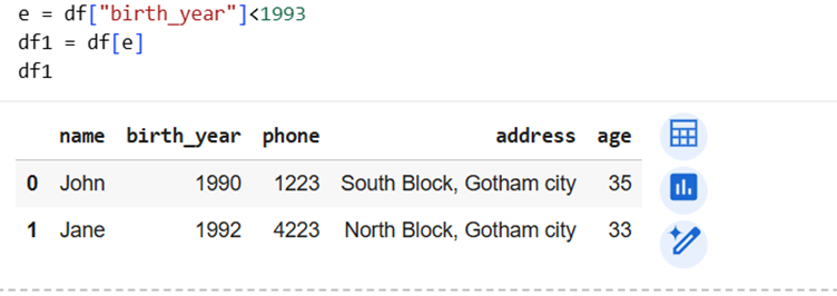 | Filter rows by condition | df[df["birth_year"] > 1993] |