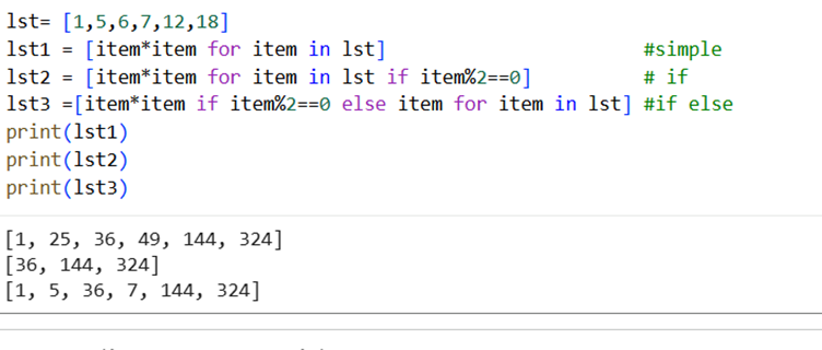 We can also have else condition too. Suppose, in lst2, we want squares of even numbers but keep odd numbers as it is: